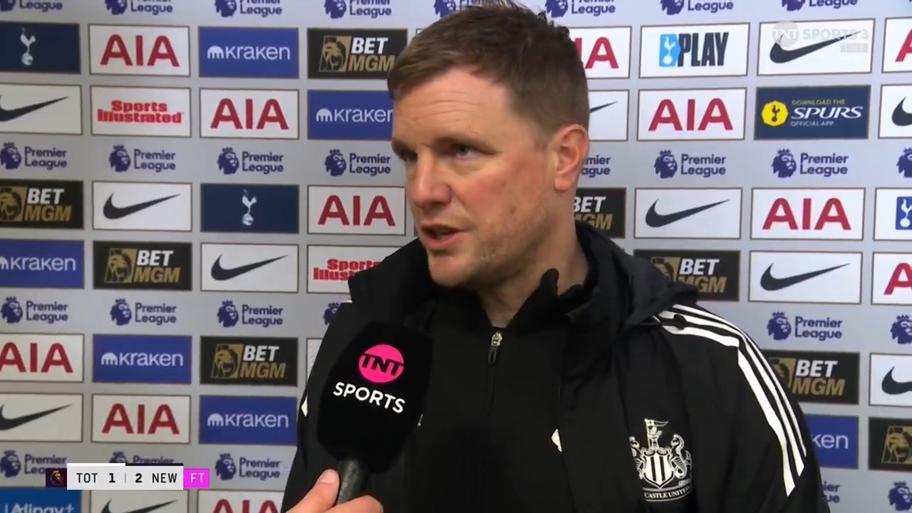 率队在英超第26轮客场2-1击败托特纳姆热刺之后,纽卡斯尔联主教练埃迪-豪接受了来自TNT体育的采访。祝贺你,除了对今天晚上的胜利感到满意以外,你对你的球队完成比赛的方式又感到有多高兴呢?是的,今天晚上对我们来说是一场非常精彩的表演。我的意思是,我认为这是一场极其特别的比赛,因为我不认为在托特纳姆热刺进球的时候我们理应处于平局的状态,我觉得他们的进球是在我们掌控局面的情况下突然打进的。随后我真的要